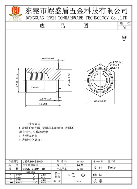 BSOS-M4-10 不銹鋼壓鉚螺母柱