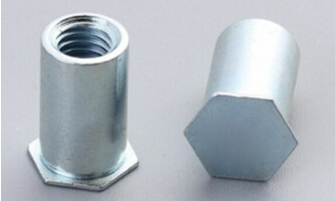 壓鉚螺母柱其外形一端呈六角形,另一端為圓柱狀,六角邊與圓柱狀中間有一道退刀槽,其內(nèi)形為內(nèi)螺紋,通過壓力機將六角頭壓入薄板的預置孔內(nèi)(預置孔的孔徑一般略大于壓鉚螺柱的圓柱外徑)使孔的周邊產(chǎn)生塑性變形,變形部分被擠入壓鉚螺母柱的退刀槽內(nèi),使壓鉚螺母柱鉚緊于薄板上,從而在薄板上形成一下有效固定的內(nèi)螺紋。