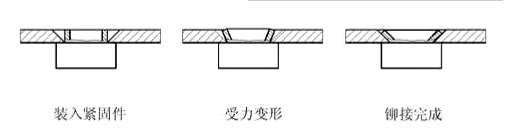 1) 拉鉚是指在鉚接過程中,鉚接件在外界拉力的作用下,發(fā)生塑性變形,其變形的位置通常在專門設(shè)計的部位,靠變形部位夾緊基材來實現(xiàn)可靠的連接。常用的拉鉚螺母就是采用此種鉚接型式實現(xiàn)與基材的連接。