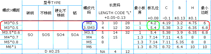 壓鉚螺母柱規(guī)格表中紅色框線圈出的兩行數(shù)值,螺紋X螺距一欄有兩個(gè)M3*0.5,而相對(duì)應(yīng)藍(lán)色框線的螺紋代碼分別是M3和3.5M3兩種,它們有什么不同呢?我們?cè)倏淳G色圈出的部分?jǐn)?shù)值:螺紋代碼M3對(duì)應(yīng)的板孔徑為4.2,螺紋代碼3.5M3對(duì)應(yīng)的板孔徑為5.4。我們可以清楚知道螺紋代碼的數(shù)值匹配不同的板孔徑。