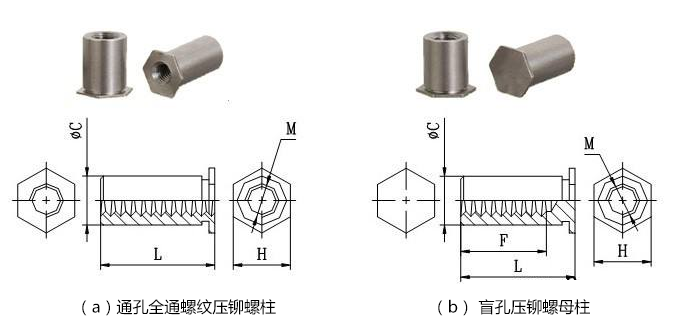 我們先來說說緊固件中的六角壓鉚螺母柱,它主要用于鈑金的間隔安裝或鈑金與電子間隔疊式安裝,也用于機械外殼的疊式安裝等。六角壓鉚螺母柱分為通孔和盲孔兩種類型,通常用SO代表通孔、BSO代表盲孔。螺紋分公制和英制,SO還分全螺紋和半螺紋,常用長度范圍6mm~30mm,六角壓鉚螺母柱材質(zhì)有銅、鋁、鐵不銹鐵、不銹鋼等,不同材質(zhì)的鈑金選用不同材質(zhì)的螺柱。