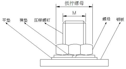 把所需要檢驗的六角平齊型壓鉚螺釘壓入鋼板,然后按次裝上平墊、彈墊、螺母。