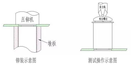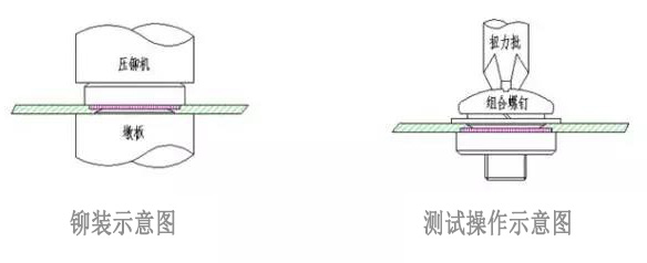 把所需要檢驗的壓鉚螺母柱如上圖壓入鋼板,然后裝上組合螺釘。