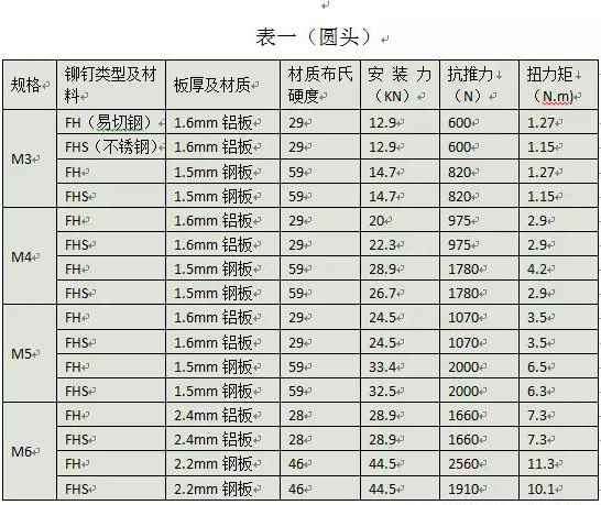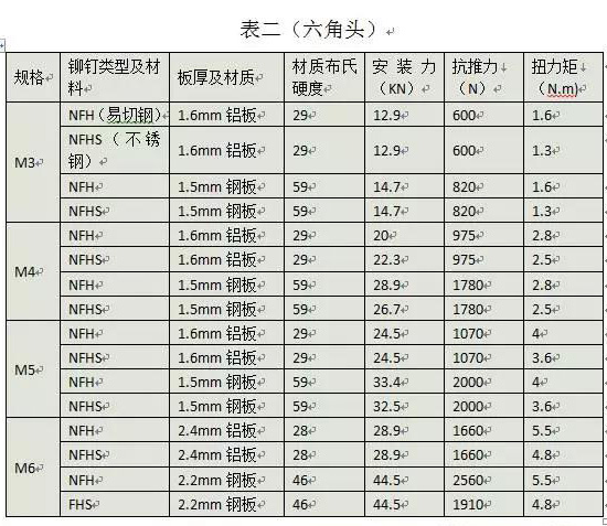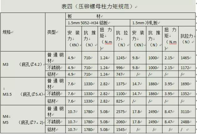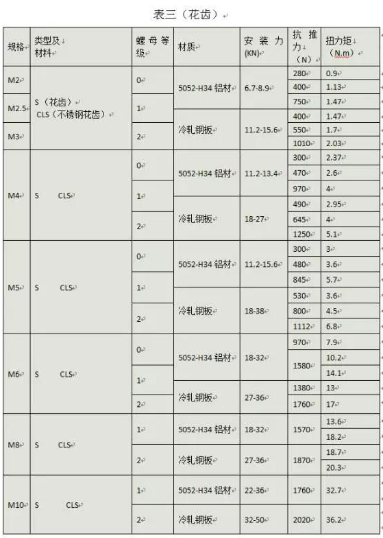 壓鉚螺母推力及扭力規(guī)范(附表三)