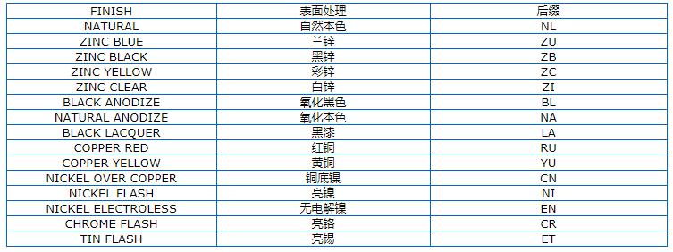 壓鉚螺母,壓鉚螺柱,壓鉚螺釘及其它壓鉚緊固件在其規(guī)格描述中以最后的兩位英文字母代號作為后綴,該代號代表表面電鍍的類型,如S-M3-1 ZI中的ZI表示該壓鉚螺母鍍白鋅。