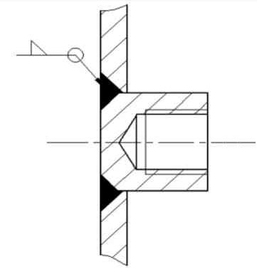 該機箱材質為Q235,板厚1.5 mm,主要工序有折彎、焊接、電鍍和噴漆等。由上述分析可知,該零件的壓鉚工序應安排在電鍍工序完成后。而零件電鍍后,已折彎焊接成型,使壓鉚空間受限。針對上述問題,經分析研究,加工策略采用焊接工藝,將壓鉚螺柱改為焊接鋼螺柱,可避免壓鉚螺柱被電鍍溶液腐蝕;同時由于焊接鋼螺柱與機箱材質相同,可在機械加工完成后與箱體一起鍍鋅,螺柱也得到了相應的防銹處理,有效解決了該類鈑金件的螺柱安裝問題。具體加工工藝如下:01用Q235-A棒料,根據壓鉚螺柱長度和內螺紋深度,車削加工出相同尺寸的鋼螺柱,在螺柱一端棱邊倒C1斜角(見圖3);02根據鋼螺柱外圓,在機箱安裝位置配鉆底孔,并沉孔;03加工機箱外形;04根據底孔位置,將鋼螺柱焊接在機箱上(見圖4);05機箱外表面焊疤打磨平整;06機箱鍍鋅、噴漆。