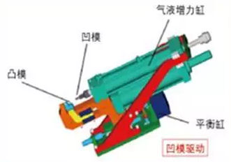 一般凸模驅(qū)動鉚接過程為凸模從上側(cè)厚板零件沖向下側(cè)薄板零件,而在零件制造過程中,厚板零件放置在下側(cè)時,需采用凹模驅(qū)動裝置,即氣液增力缸驅(qū)動上部薄板側(cè)凹模下行,保證凸凹模與板料貼合,而凸模沖壓下部厚板側(cè)板料進入凹模的動作需要采用平衡缸帶動整個槍體運動補償完成。平衡缸的設(shè)置也直接影響鉚點的底厚,平衡缸設(shè)置不合理容易產(chǎn)生鉚點底厚不達標(biāo),或鉚點周圍表面出現(xiàn)凹坑的現(xiàn)象,影響鉚接零件質(zhì)量。凹模驅(qū)動設(shè)備如圖6所示。