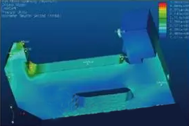 鉚接槍一般為C形,在鉚接過程中,鉚接槍在沖壓力的作用下會產(chǎn)生槍體變形(見圖7),若整個槍體的剛度不足,其變形量超過許用值將導(dǎo)致鉚接板料之間無法形成有效鑲嵌,從而降低鉚接強度。因此,在鉚接槍設(shè)計時,需要根據(jù)板材匹配確定的模具及沖壓力值,計算鉚接槍在該沖壓力作用下的變形情況,通過更改鉚接槍局部結(jié)構(gòu)設(shè)計或材料厚度來確保鉚接槍變形量在合理范圍內(nèi),以保證鉚接接頭的質(zhì)量。