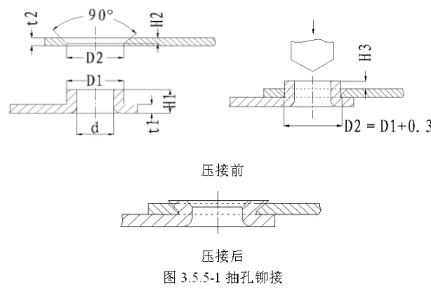 抽孔鉚接是采用其中一個(gè)零件沖孔,另一個(gè)零件沖孔翻邊,通過鉚接使之成為不可拆卸的連接體。優(yōu)點(diǎn):翻邊與直孔相配合,本身具有定位功能,鉚接強(qiáng)度高,通過模具鉚接效率也比較高,具體方式如圖3.5.5-1所示: