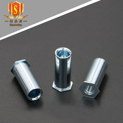 上面這種叫SO(通孔)壓鉚螺柱,當(dāng)然,還有盲孔的,就是六角這一頭是不通的,叫BSO,它長(zhǎng)的是這樣的: