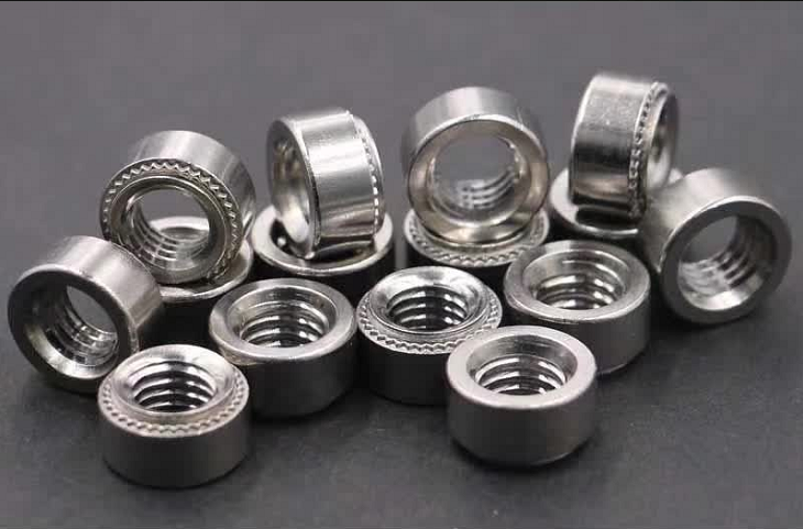 壓鉚螺母又叫鉚螺母,自扣緊螺母,是應用于薄板或鈑金上的一種螺母,外形呈圓形,一端帶有壓花齒及導向槽。其原理是通過壓花齒壓入鈑金的預置孔位,一般而言預置孔的孔徑略小于壓鉚螺母的壓花齒,通過壓力使壓鉚螺母的花齒擠入板內使導致孔的的周邊產生塑性變形,變形物被擠入導向槽,從而產生鎖緊的效果。