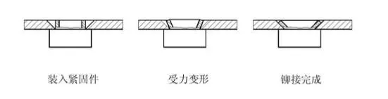 拉鉚是指在鉚接過程中,鉚接件在外界拉力的作用下,發(fā)生塑性變形,其變形的位置通常在專門設計的部位,靠變形部位夾緊基材來實現可靠的連接。常用的拉鉚螺母就是采用此種鉚接型式實現與基材的連接的。拉鉚使用專用的鉚槍進行鉚接,多用在安裝空間較小,無法使用通用鉚接工裝的情況。