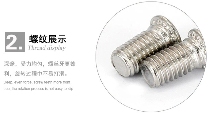因壓鉚螺釘的頭部下有齒紋壓花,當(dāng)壓入后,基體在壓鉚螺釘的周圍產(chǎn)生變形,和齒紋發(fā)生咬合現(xiàn)象,從而形成一個(gè)牢固的外螺紋。