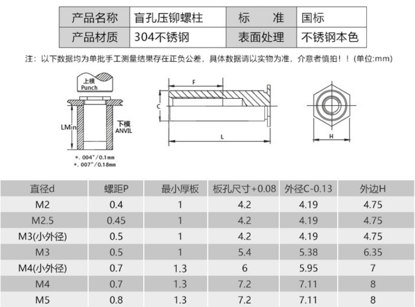 壓鉚螺母柱其外形一端呈六角形,另一端為圓柱狀,六角邊與圓柱狀中間有一道退刀槽,其內(nèi)形為內(nèi)螺紋,通過壓力機(jī)將六角頭壓入薄板的預(yù)置孔內(nèi)(預(yù)置孔的孔徑一般略大于壓鉚螺柱的圓柱外徑)使孔的周邊產(chǎn)生塑性變形,變形部分被擠入壓鉚螺母柱的退刀槽內(nèi),使壓鉚螺母柱鉚緊于薄板上,從而在薄板上形成一下有效固定的內(nèi)螺紋。螺盛盾為了方便大家可以看出其安裝方式方法,采用動(dòng)畫示意圖展示: