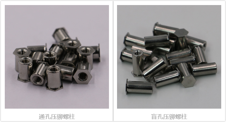 壓鉚螺柱的形狀標(biāo)準(zhǔn):這個(gè)一般有兩種,一種是通孔壓鉚螺柱,另一種是盲孔壓鉚螺柱,他們之間的主要區(qū)別在于螺柱里的孔是不是通的。